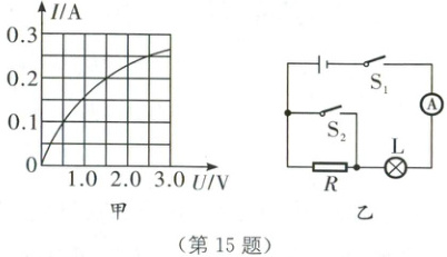 15. 小灯泡的 $ I - U $ 图像如图甲所示,将它与定值电阻 $ R $ 接入图乙所示的电路中。只闭合开关 $ S_1 $,电流表的示数为 $ 0.2 \, A $;再闭合开关 $ S_2 $ 时,电流表的示数为 $ 0.25 \, A $。则电源电压为