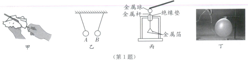 D [解析]如题图甲所示,丝绸摩擦过的玻璃棒会带上正电荷,这个过程中丝绸会得到电子,A错误;如题图乙所示,细线悬挂的轻质泡沫塑料小球相互吸引,由于带电体具有吸引轻小物体的性质,则两小球可能带有异种电荷或其中一个带电,另一个不带电,B错误;如题图丙所示,验电器是利用了同种电荷相互排斥的原理制成的,C错误;如题图丁所示,摩擦后的带电气球能够吸引不带电的细水流,是因为带电体具有吸引轻小物体的性质,D正确.故选D.