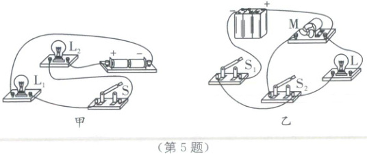5. 在如图所示的甲、乙两个实物图中,闭合所有开关,各元件均能正常工作.现将一根导线接到两电路中的不同位置,会有不同的现象发生,下列说法正确的是(