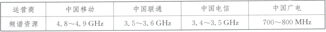 12. 工信部将5G牌照发给了中国移动、中国联通、中国电信以及中国广电四家公司.其获得的频谱资源如表所示.1 GHz= $10^{9}$ MHz= $10^{9}$ Hz.根据下面的波谱图解答问题.
