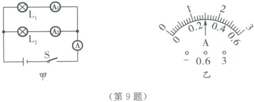 9. 如图甲所示电路,闭合开关 S 后,两个灯泡都能发光,图乙为电流表 A 指针的位置,电流表 $ A_2 $ 读数是 0.6 A,下列分析正确的是(