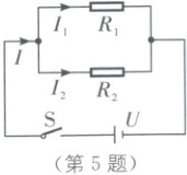 5. 如图所示电路,电阻 R_1、R_2并联后接到电压为 U 的电源两端。闭合开关 S 后,通过电阻 R_1、R_2的电流分别为 I_1、I_2,电路的总电流为 I。
