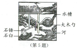 5. 如图所示是我国《农书》中记录的槽碓(duì).大木勺积水较多会下沉,使石锤上升;当大木勺内的水流出变轻后,石锤落下击打石臼的谷物.该槽碓(