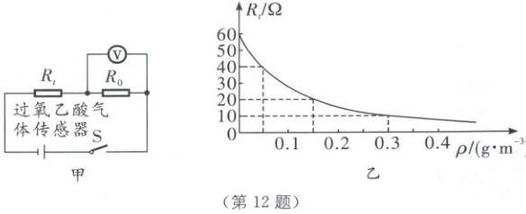 12. 为减少病毒传染,确保全校师生身体健康,学校利用过氧乙酸对办公室、教室等室内的空气进行熏蒸消毒.某科技兴趣小组设计了一个简易检测仪,检测教室空气中过氧乙酸气体的浓度,其电路原理如图甲所示,电源电压为 12 V,$ R_0 $ 为定值电阻,过氧乙酸气体传感器 $ R_t $ 的阻值随过氧乙酸气体浓度 $ \rho $ 的变化关系如图乙所示.