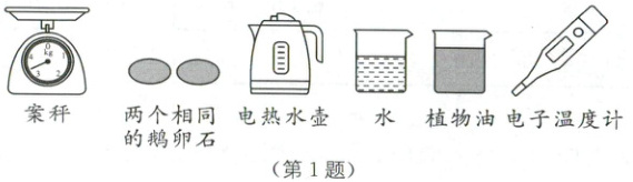 小明利用如图所示器材测量家中植物油的比热容. 假设周围环境的气压为一个标准大气压,忽略鹅卵石、水和植物油在空气中的热量散失.