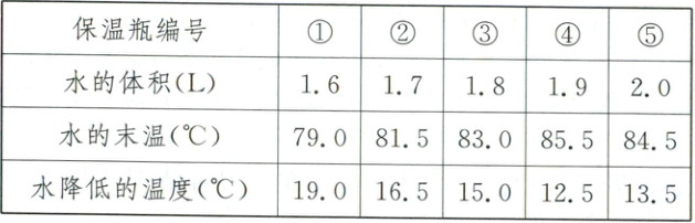 来反映保温瓶的保温效果, 这种研究方法称为转换法.(2) 分析实验数据可以得出初步结论: 在其他条件相同的情况下, 水量少于 $ 1.9L $ 时, 水量越多, 其保温效果越