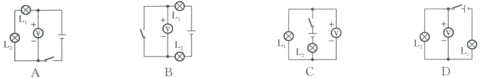 2. 下列电路图中,电压表能直接测量灯泡$L_1$两端电压的是(