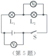 B [解析]由电路图可知,两个灯泡串联,电压表测量灯泡L₂两端的电压,即L₂两端的电压为2.5V,L₁两端的电压为U₁=U−U₂=6V−2.5V=3.5V,A错误,B正确;电压表测量灯泡L₂两端的电压,L₂两端的电压为2.5V,电源电压为6V,电源与L₁两端电压之和应该大于电源电压,不可能等于2.5V,且图中电压表无法测出电源与L₁两端电压之和,C错误;L₁和L₂串联接入电路,由串联电路电流关系可知,通过两个灯泡的电流大小是相等的,D错误。故选B