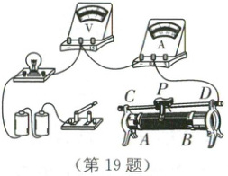 19. (2024·广东汕头潮南区期末)如图所示的实物电路,用笔画线添加两根导线,要求:闭合开关,滑动变阻器滑片P向左移动时,灯亮度变暗,电流表示数变小,电压表只测量灯两端电压.