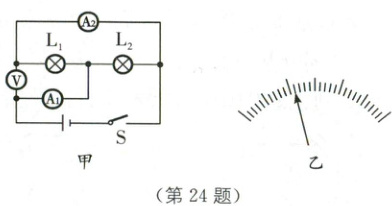 24. 如图甲所示电路,开关S闭合后$,A_1、$$A_2、$V三只电表的指针均如图乙所示,已知电压表接入的是“0~15V”的量程,问: