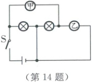 14. (2024·江苏南通海门区期中)在如图所示的电路中,已知电源电压是 8 V,若在甲、乙两处分别接入电表,当开关 S 闭合后,两灯均能正常发光,通过$ L_1、$$L_2$的(左边的为$ L_1)$电流分别是 1 A、2 A,则甲表是