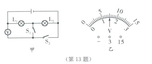 13. 如图甲所示电路,电源电压恒定,当闭合$ S_1、$断开$ S_2$时,灯$ L_1$与$ L_2$