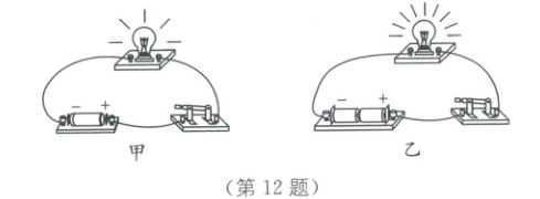12. 小京用如图所示的装置进行实验。如图甲所示,闭合开关发现小灯泡亮度比较暗,如图乙所示,保持其他器材不变,把电池增加至两节,闭合开关发现小灯泡的亮度变亮,小京探究的问题是