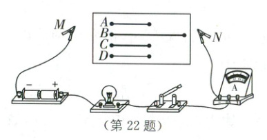 22. (5 分)控制变量法(2024·江苏南京秦淮区期末)在探究“影响导体电阻大小因素”的实验中,保持电源电压不变,如图所示,在 M、N 两点之间分别接入不同的电阻丝,其规格如下表所示。