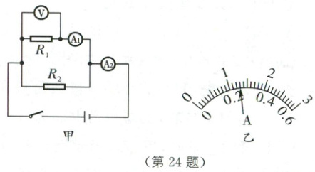 24. 如图甲所示,这是某个同学连接的电路,其中电压表示数为 3 V,两电流表指针如图乙所示,都在同一位置。求: