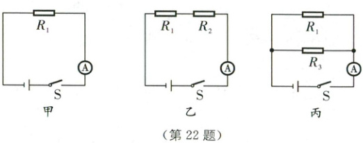 22. (6分)如图甲所示电路,电阻$R_{1}的阻值为5 \, \Omega$,闭合开关后,电流表示数为$2.4 \, A$。