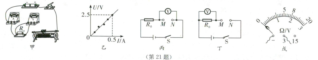 ①小明在电路的M、N两点之间接入一个电阻箱,调节旋钮使它接入电路的阻值分别为5Ω、8Ω、20Ω,闭合开关,发现电压表指针分别指向1.5V、2.0V、3.0V的刻度线,于是他在表盘相应位置标出了电阻的数值,如图戊所示. 以此类推再标出其他刻度线,电压表就可以用来间接测量阻值了,由以上数据可知,电源电压为______V,定值电阻R₀的阻值为______Ω;