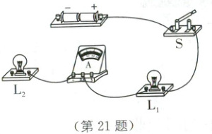 21. 在图中,补上适当的导线,使 $L_1$ 和 $L_2$ 并联,开关控制 $L_1$ 和 $L_2$,电流表测量 $L_1$ 中的电流.