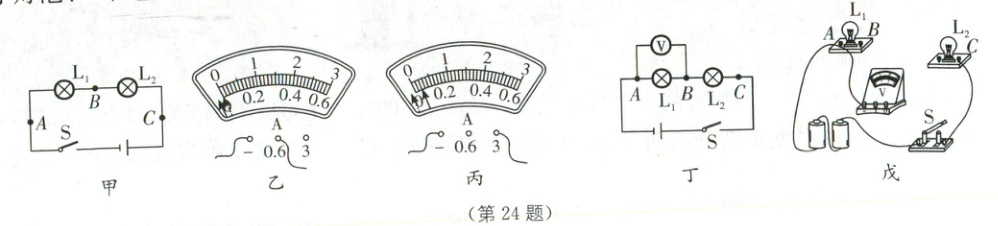 24. (6 分)如图甲所示是小明“探究串联电路电流和电压特点”的实验电路图,实验器材:两节干电池、多个小灯泡、一个电压表和一个电流表、一个开关和若干导线.