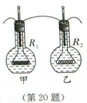 20. 小华将电阻丝 $R_1$ 和 $R_2(R_1 > R_2)$ 分别浸没在质量和初温均相同的煤油中,按如图所示接入电路,开关闭合后,通过两电阻丝的