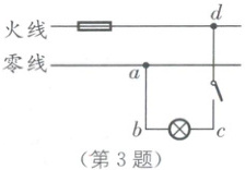3. 小阳闭合开关后,发现电灯不亮,他用测电笔测试如图所示的$a$、$b$、$c$、$d$四点,只有$d$点发光,那么可能发生的故障是(