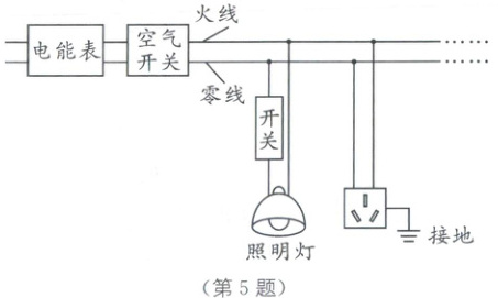 5. (2024·武汉中考)如图所示是某同学家部分家庭电路的示意图。电能表上标有“$220V$ $10(40)A$”字样,他家正在使用的所有用电器总功率为$6kW$,其中电饭煲的功率为$1.5kW$,饭煮熟后,他将这个电饭煲的插头从插座中拔出,再将功率为$1kW$的电热水壶插入插座中,其他用电器仍正常工作,闭合电热水壶上的开关,空气开关跳闸。空气开关跳闸的原因可能是(