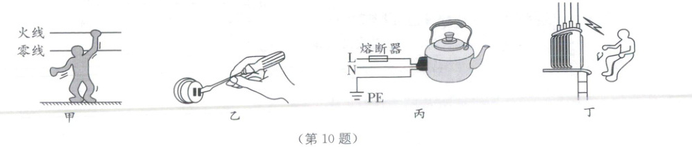 C [解析]图甲中,站在地上的人用手去接触裸露的火线,电流从火线经人体流向大地,会造成人体触电,A不符合安全用电原则;图乙中,手握住测电笔笔尖金属体去检验插座中的火线会造成触电,手应该只接触笔尾的金属体才能安全地使用并且得出正确的判断,B不符合安全用电原则;图丙中,电水壶的外壳与保护接地线PE相连接,熔断器接在火线上,C符合安全用电原则;图丁中,小孩靠近高压设备嬉戏、玩耍,容易引发高压电弧触电,D不符合安全用电原则.归纳总结从安全用电的角度进行分析: