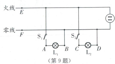 9. (2024·武汉模拟)在如图所示的电路中,若只闭合开关$S_2$,用测电笔测$A$、$B$、$C$、$D$四点,发现测电笔氖管都发光,已知电路中装有保险丝,当电流过大时,保险丝将被烧断,则下列故障原因判断正确的是(