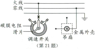 21. (2024·山东济宁嘉祥县期末)请在图中把吊扇按安全用电原则接入家庭电路中,要求当调速开关滑片顺时针转动时,可以减慢吊扇转速。
