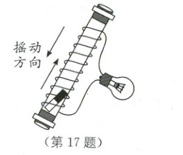 17. 小明自制了如图所示的实验装置,将带绝缘层的导线绕在塑料管外,导线两端连接着小灯泡,形成闭合电路,管内封闭一个强磁体,沿如图所示方向来回快速摇动装置,小灯泡______(填“会”或“不会”)发光,在摇动的过程中,灯丝中电流方向是______(填“变化”或“不变”)的。