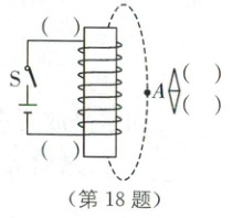 18. (2024·河北唐山古冶区期末)如图所示,小磁针静止在通电螺线管右侧。请分别在括号中标出通电螺线管和小磁针的N、S极,并在虚线上的A点用箭头标出磁感线方向。