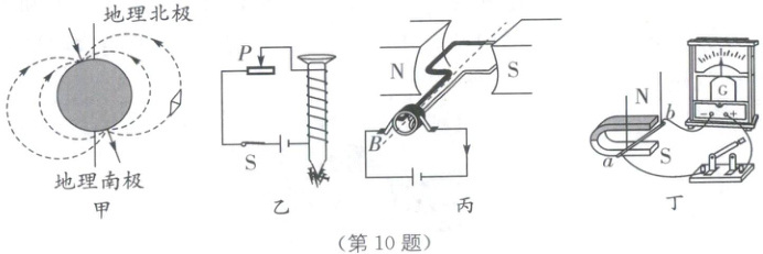 B[解析]磁感线是假想的模型,不是真实存在的,小磁针的北极指向地理的北极,A错误;根据安培定则,电流从上方流入,铁钉上端是电磁铁的N极,P向左移,电路总电阻减小,电路中的电流变大,电磁铁的磁性增强,能吸引更多大头针,B正确;电动机的转动方向与电流方向和磁场方向有关,只对调磁极,电流方向不变,线圈的转动方向发生改变,C错误;导体ab竖直向上运动,运动方向与磁感线方向平行,不能切割磁感线,故不能产生感应电流,灵敏电流计指针不偏转,D错误.故选B.