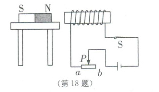 18. (4 分)如图所示,一个条形磁体放在水平桌面上,另一个带铁芯的螺线管置于条形磁体旁,闭合开关后,条形磁体向左运动,请在图中标出条形磁体的 N、S 极.