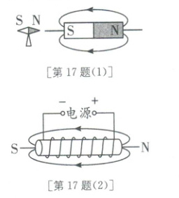 17. (4 分)(1) 请标出图甲中条形磁体周围磁感线的方向和小磁针的 N、S 极.