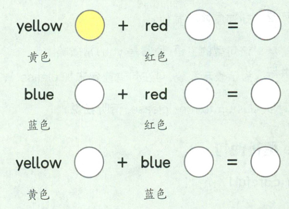 黄色+红色= 橙红色 蓝色+红色= 紫色 黄色+蓝色= 绿色(涂色略)