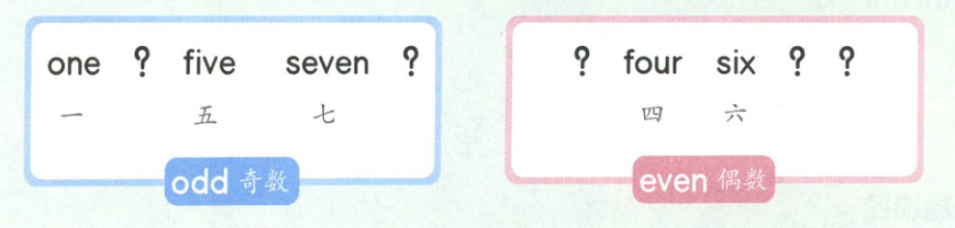 将所给数词按奇数、偶数分类,并写在相应的方框中。然后读一读每组中的数词