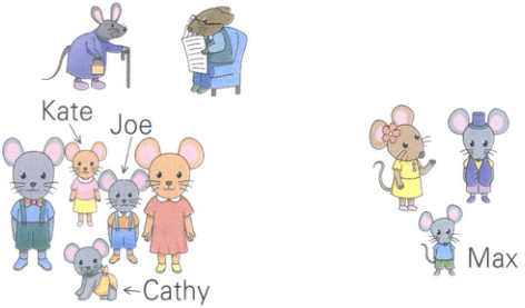 <题目>小老鼠 Cathy 在介绍自己的家庭成员。根据图片及提示,判断介绍的内容与图片是(√)否(×)相符。