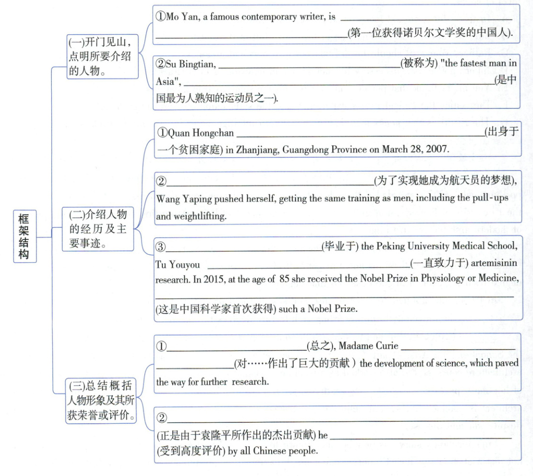 常用表达 (一) ①the first Chinese to win the Nobel Prize in Literature ②who is referred to as; is one of China's most well-known athletes (二) ①was born into a poor family ②To achieve/realize her dream to be an astronaut ③Graduating from; has been devoted herself to; which was the first time for a Chinese scientist to receive (三) ①All in all/To sum up; made a huge contribution to/towards ②It was because of the outstanding contributions Yuan Longping made that; was highly thought of