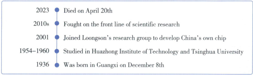 Huang Lingyi,known as the "Mother of Loongson" in China,is a hero in my heart. Born on December 8th,1936,Huang studied in Huazhong Institute of Technology and Tsinghua University from 1954 to 1960. She was such a diligent woman that she committed herself to the design of integrated circuits. In 2001,she joined Loongson's research group to develop China's own chip. Even in her seventies,she still fought on the front line of scientific research. Sadly,she passed away on April 20,2023.