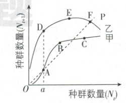 9. 如图中甲、乙两条曲线分别表示某湿地中两种生物当年的种群数量$(N_{t})和一年后的种群数量(N_{t+1})$之间的关系,虚线P表示$N_{t+1}= N_{t}$。下列有关叙述错误的是(
