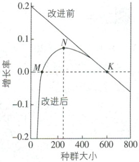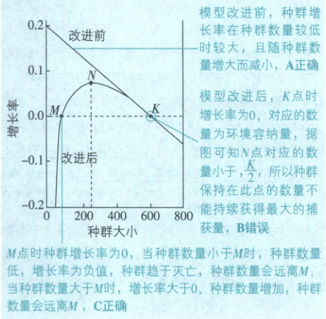 模型改进后,K点时增长率为0,对应的数量为环境容纳量,据图可知N点对应的数量小于$\frac{K}{2}$,所以种群保持在此点的数量不能持续获得最大的捕获量,B错误。