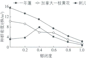 3. 教材变式[河北邢台 2025 高二月考]林木郁闭度反映了林木冠层对地面遮蔽的程度,没有林木时为 0,完全遮蔽地面时为 1。如图是某地人工柳林中几种草本植物的种群密度随林木郁闭度的变化。下列说法错误的是(