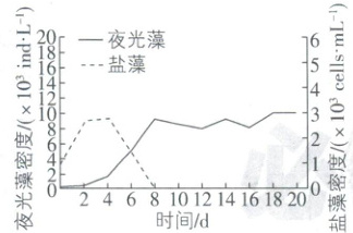 2. [山东菏泽 2024 高二期末]夜光藻是我国引发赤潮的主要藻类之一,它不进行光合作用,主要以盐藻(一种绿藻)为食,在光照适宜且密封条件下,共同培养夜光藻和盐藻一段时间,观察并记录两者的密度,得到如图结果。下列说法错误的是(