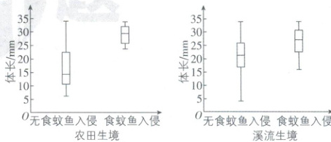 4. [江苏泰州中学 2025 高二期中]唐鱼是华南地区的小型濒危杂食性鱼类,入侵物种食蚊鱼会捕食唐鱼。研究人员调查比较了在不同生境中唐鱼种群的体长在食蚊鱼入侵取样点与无入侵取样点间的差异。图中矩形代表体长集中分布区域,其内黑色横线表示平均值,垂直线段表示数值的变动范围,上下两端分别表示最大值和最小值;体长与鱼龄相关。下列推测错误的是(