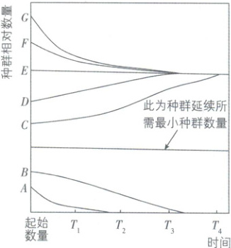 A 【解析】E代表该环境所能维持的种群最大数量(K值),并非种群数量能够达到的最大值,种群数量可以在K值上下波动,A错误;根据阿利效应推测,栖息地碎片化,种群被分散,可能导致种群数量低于种群延续所需最小值,进而导致种群灭亡,B正确;性别比例影响出生率,因此改变初始雌雄比例,会造成一定程度上的性别比例失调,可能导致种群延续所需最小种群数量变大,C正确;在T₄前,起始值为C的种群,其数量保持增长,即种群增长速率大于0,D正确。 易错点:环境容纳量不是种群数量能达到的最大值,而是环境所能维持的种群最大数量