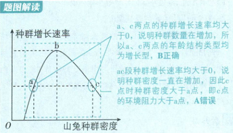 a、c两点的种群增长速率均大于0,说明种群数量在增加,所以a、c两点的年龄结构类型均为增长型,B正确 ac段种群增长速率均大于0,说明种群密度一直在增加,因此c点时种群密度大于a点,即c点的环境阻力大于a点,A错误 【解析】标记重捕法计算种群总数的公式是初捕数/种群总数=重捕标记数/重捕数,所以山兔种群达到K值之后,种群总数约为32×36÷4=288(只),由于调查样方总面积为2hm²,所以平均种群密度约为144只·hm⁻²,C错误;山兔种群达到K值之后,种群数量会在K值上下波动,并非不再发生改变,D错误。 易错点:一定要注意调查样方的总面积是否为单位面积