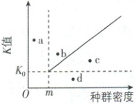 5. (不定项)[山东2025·19]种群延续所需要的最小种群密度为临界密度,只有大于临界密度,种群数量才能增加,最后会达到并维持在一个相对稳定的数量,即环境容纳量(K值)。不同环境条件下,同种动物种群的K值不同。图中曲线上的点表示在不同环境条件下某动物种群的K值和达到K值时的种群密度,其中m为该动物种群的临界密度,K₀以下的环境表示该动物的灭绝环境。a、b、c、d四个点表示不同环境条件下该动物的4个种群的K值及当前的种群密度,且4个种群所在区域面积相等,各种群所处环境稳定。不考虑迁入迁出,下列说法错误的是 ( )