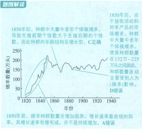 1850年后,由于放牧活动和对羊产品的市场需求,种群中大量中老年个体被捕杀,导致生殖前期个体数大于生殖后期的个体数,因此种群的年龄结构呈增长型,C正确,使种群数量在132万 - 225万头之间波动,种群数量波动主要受到人为(捕杀)影响,D错误。
