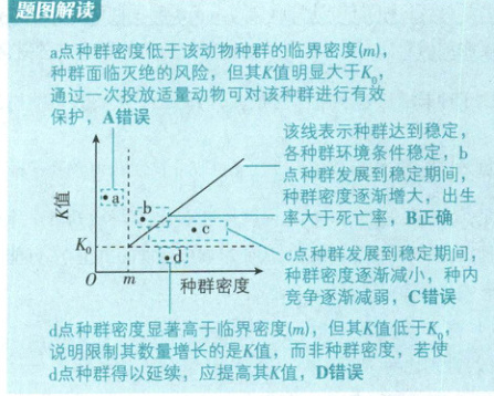 a点种群密度低于该动物种群的临界密度(m),种群面临灭绝的风险,但其K值明显大于K₀,通过一次投放适量动物可对该种群进行有效保护,A错误;该线表示种群达到稳定,各种群环境条件稳定,b点种群发展到稳定期间,种群密度逐渐增大,出生率大于死亡率,B正确;c点种群发展到稳定期间,种群密度逐渐减小,种内竞争逐渐减弱,C错误;d点种群密度显著高于临界密度(m),但其K值低于K₀,说明限制其数量增长的是K值,而非种群密度,若使d点种群得以延续,应提高其K值,D错误。