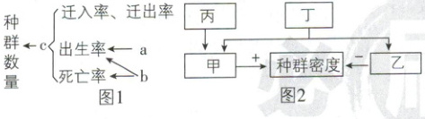 【解析】图1中b为年龄结构,既影响出生率也影响死亡率,是预测种群数量未来变化趋势的主要依据,A正确;图1中c为种群密度,是种群最基本的数量特征,能反映种群在一定时期的数量,B正确;图2中丁为年龄结构,而图1中a为性别比例,故两者表示的含义不相同,C错误;图2中丙为性别比例,通过影响出生率来间接影响种群密度,D正确。